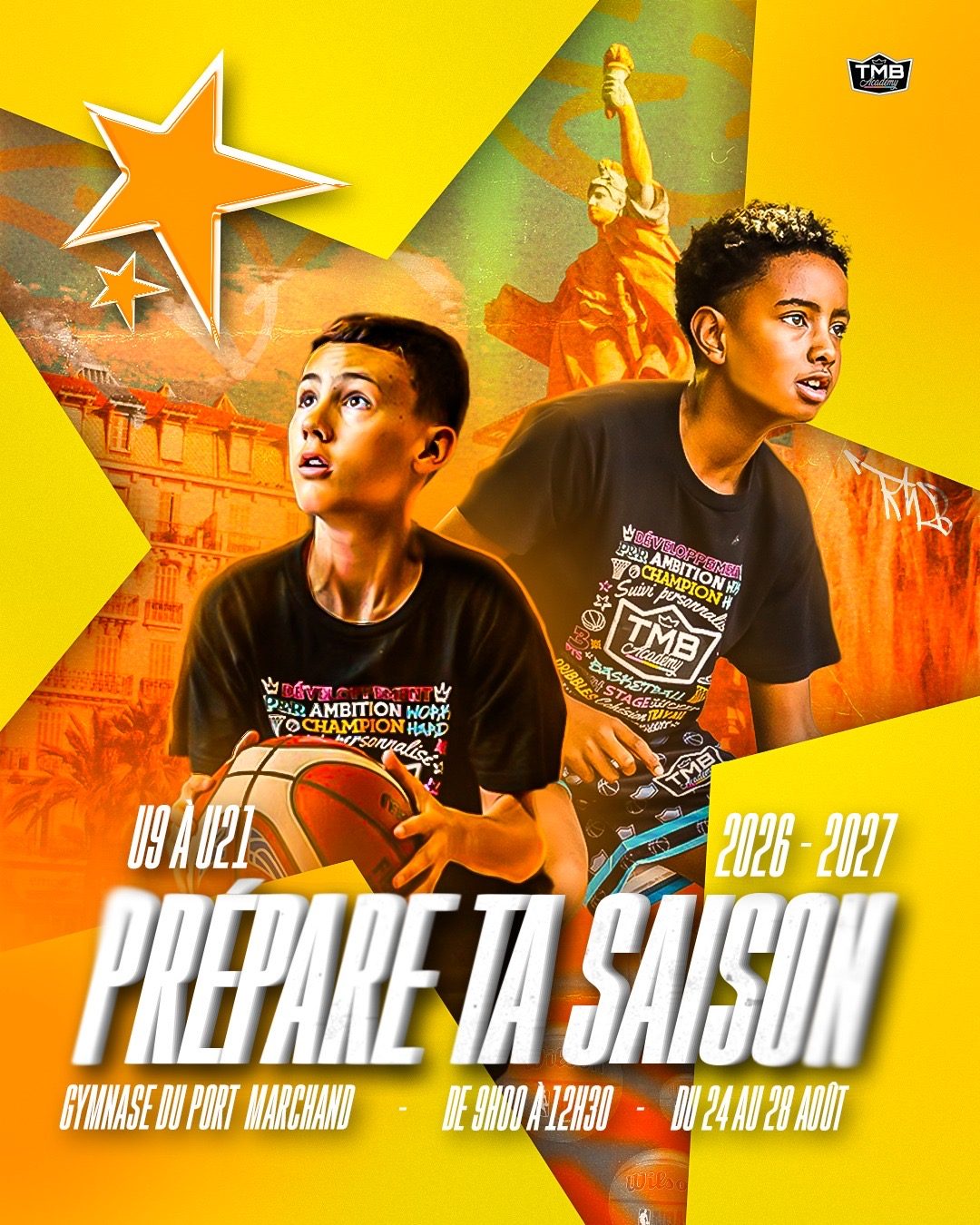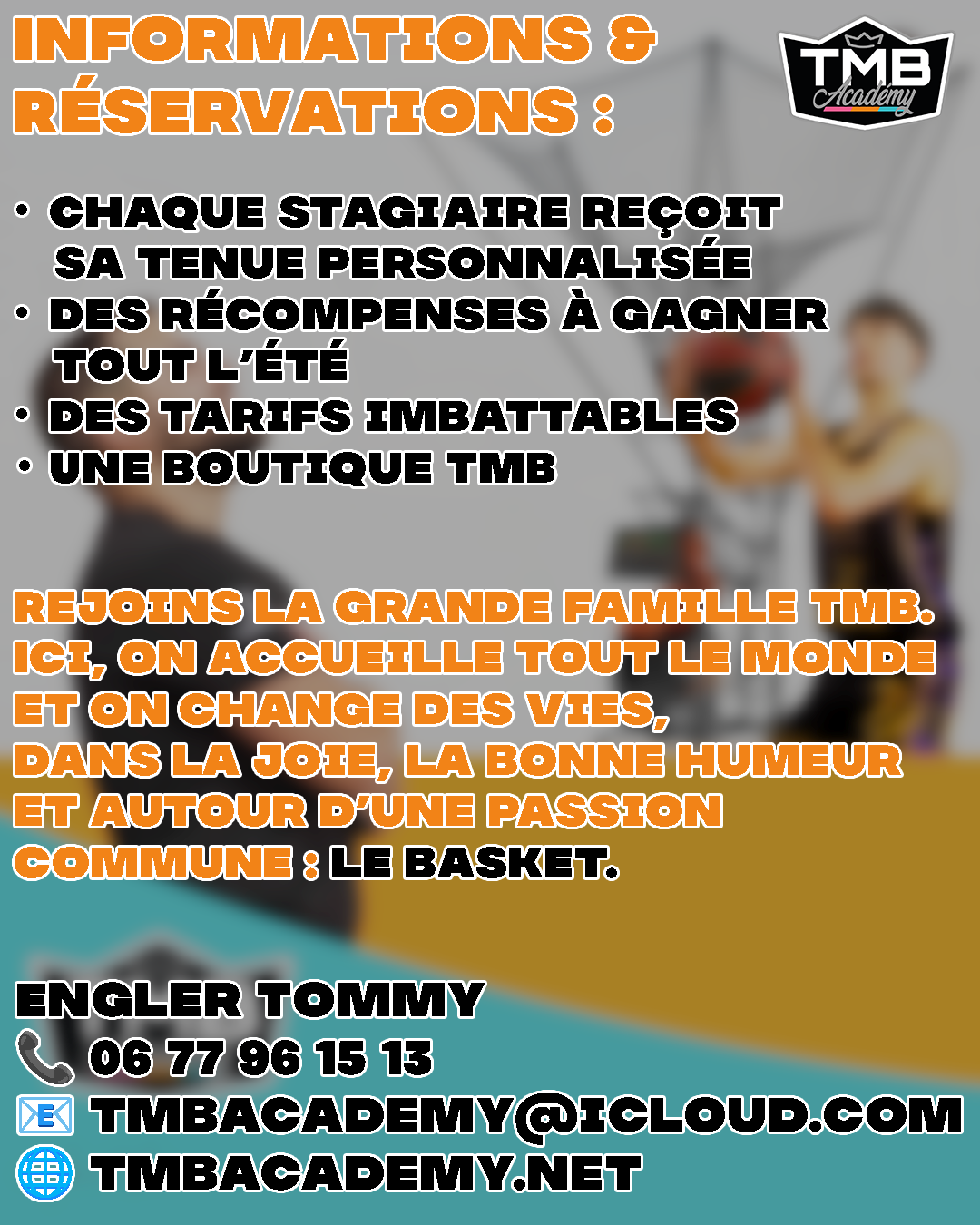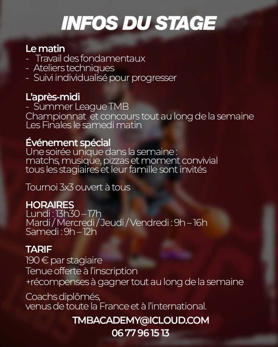 Restez connectés : toutes les informations sur les stages, événements et inscriptions seront communiquées sur nos réseaux sociaux (Facebook, Instagram, TikTok). Abonnez-vous pour ne rien manquer et préparer votre été basket avec la TMB.