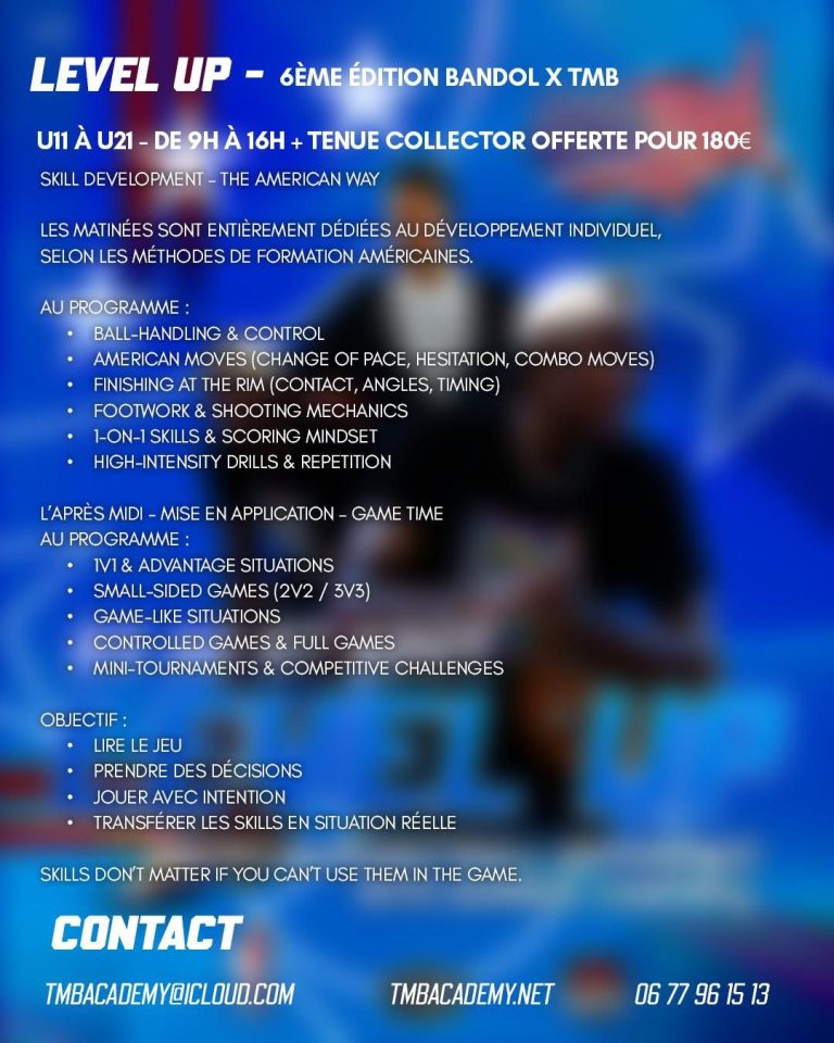 Rejoignez l’été TMB pour une expérience basket unique ! Chaque stagiaire reçoit une tenue offerte, participe à des récompenses individuelles et collectives chaque semaine, avec des cadeaux et invités surprises, et profite d’une boutique et d’une buvette sur place.